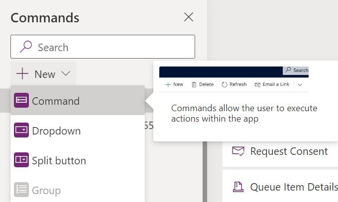 Wir können den neuen Button im modernen Designer erstellen. Vergib einen Label-Text und wähle ein Icon aus der Library aus. Das JavaScript aus dem Trigger tragen wir später im Action-Bereich ein. Zuerst kannst du Tooltip-Infos hinzufügen und festlegen, ob der Button angezeigt oder ausgeblendet werden soll. Per Drag & Drop platzierst du den Button an der gewünschten Stelle in der Command Bar.