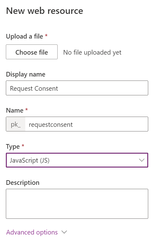 In der Library kannst du eine bestehende Script Library nutzen und dein Skript aus dem vorherigen Kapitel hinzufügen. Oder du erstellst eine neue Web Resource. Gib der Web Resource einen passenden Namen, wähle als Typ JavaScript aus und lade dort deine Skript-Datei hoch.