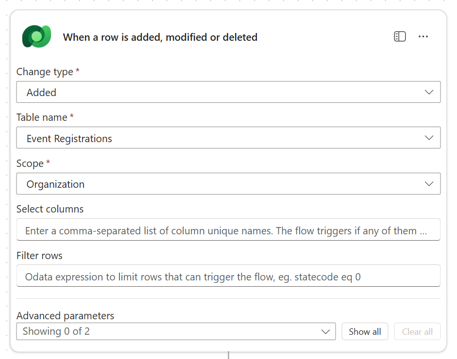 Start the flow with “When a row is added, modified or deleted” for the Event Registration table.