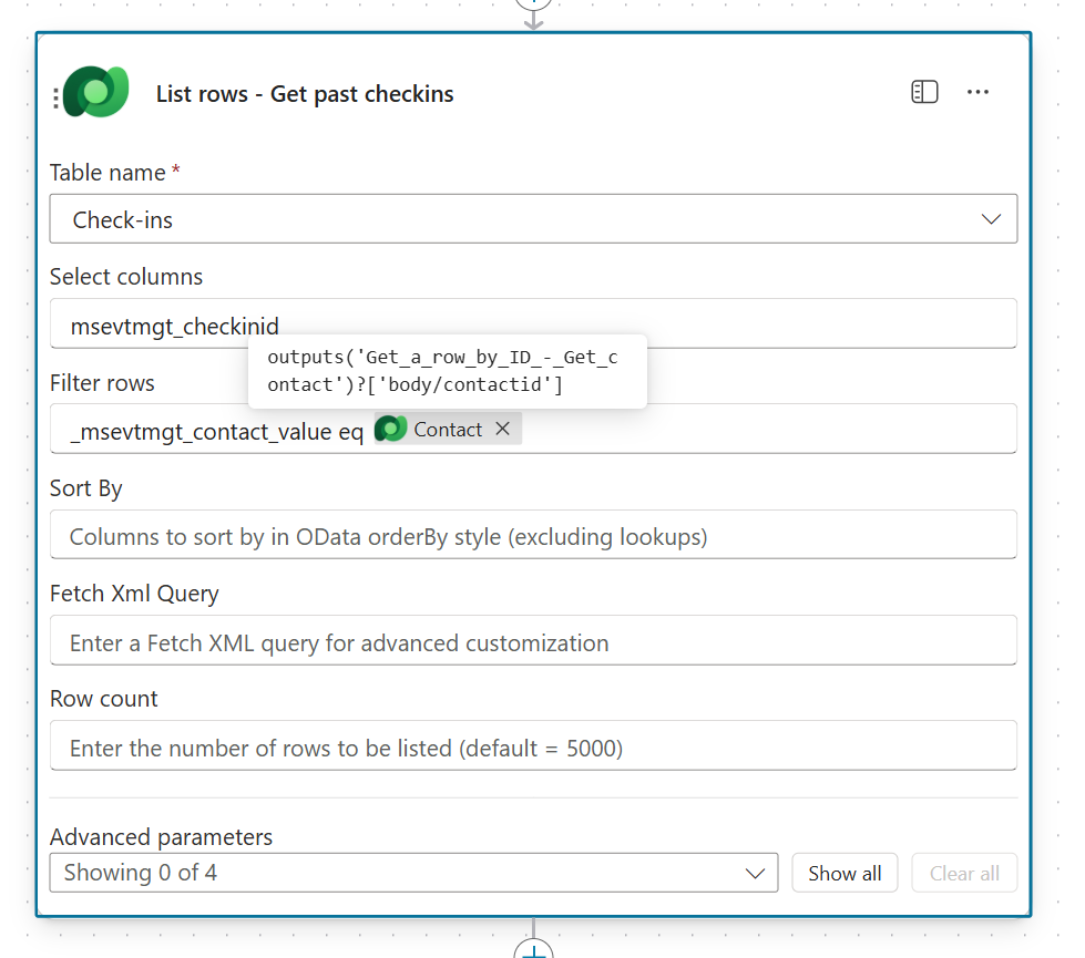 Check past event participation → add a List rows action on the Check-ins table for that contact.