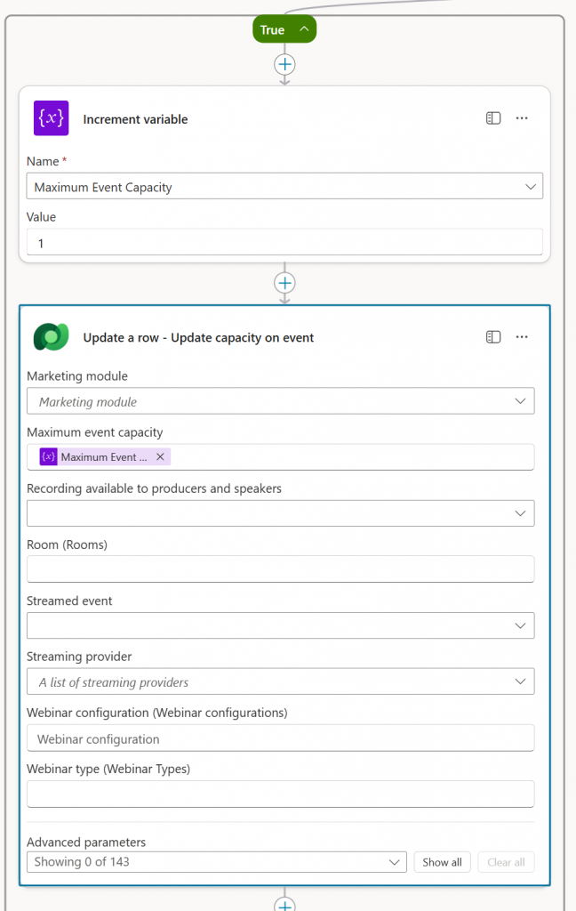 When the final outcome of the approval is “Approve”, we will increment the Maximum event capacity variable with 1 and update the field on the event accordingly.