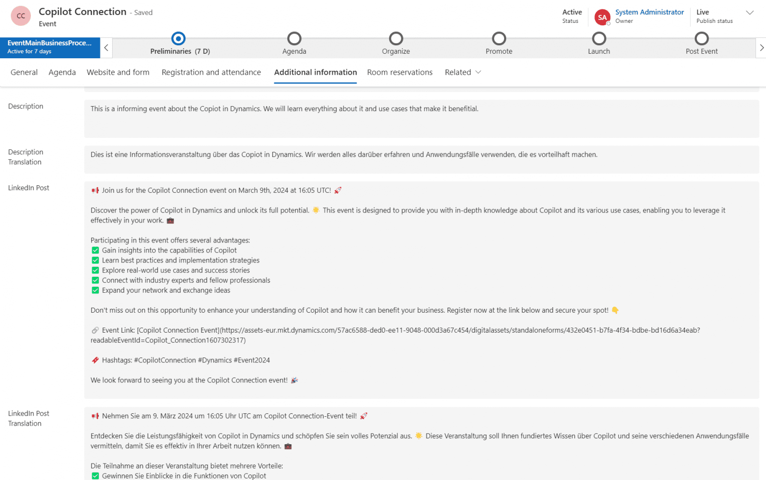 We pick up on the process and use case from the fourth part. There, we generate a social media post with AI on the basis of event data in Customer Insights Journeys. Events can also be multilingual. And the event portal also offers multilingualism as a function. This allows visitors to search for suitable events in different languages. However, translating texts is time-consuming. I know that from my own experience with this blog ;)