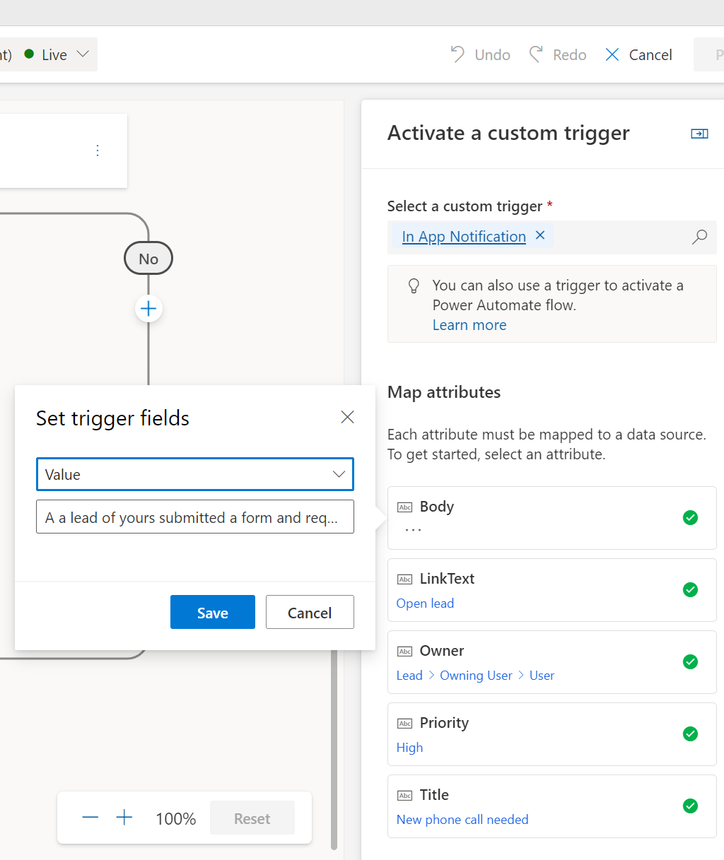 It is important to fill all attributes of my trigger. In most cases, I use the values and fill in the free text field with the text that the notification displays later in the notification. Only the receiving user is dynamic, namely the owner of the lead. In the journey, the settings for the lead look like this: