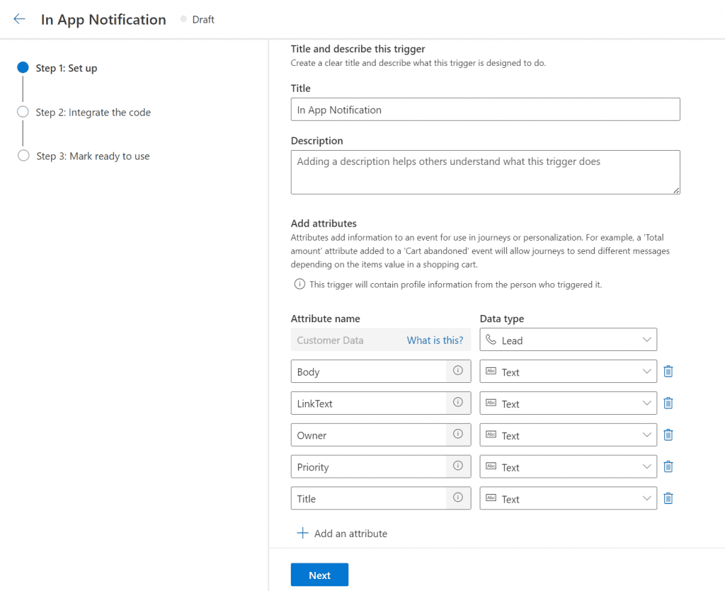 My trigger runs for the context Leads. The trigger also needs a few attributes that we will fill dynamically later via the journey. I create the following attributes, all with the type Text: Body, Owner, Priority, Title, Link Text.