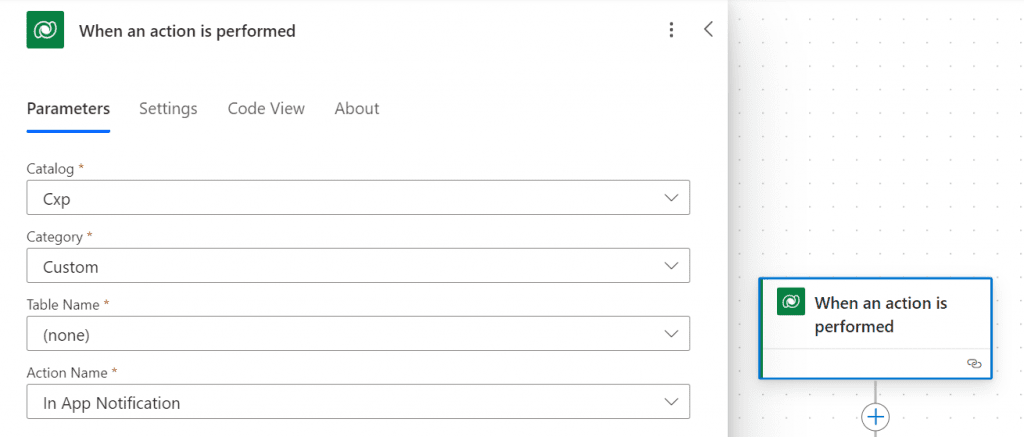 Next, I create the Power Automate Flow which starts by the journey. The flow starts with the trigger ‘When an action is performed’ and I fill the parameters with the values from the screenshot. For Action Name, I select the trigger I just created.