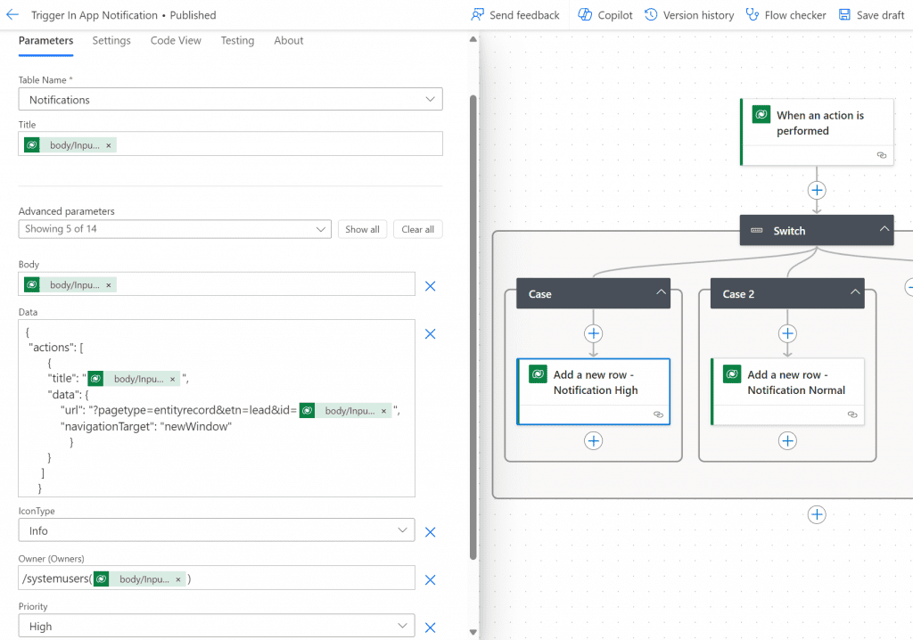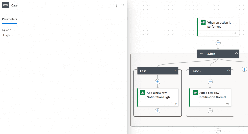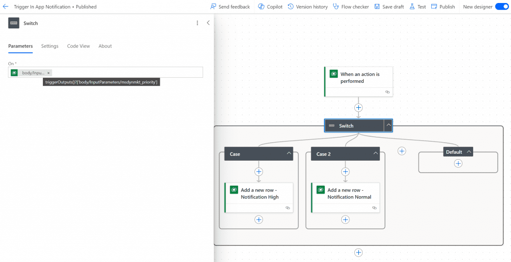 In the next step, I use the switch action. This allows me to send notifications with different priorities. I have also added priority as one of my attributes in the trigger and if this is filled with High or Normal, I can also adjust the notification accordingly.