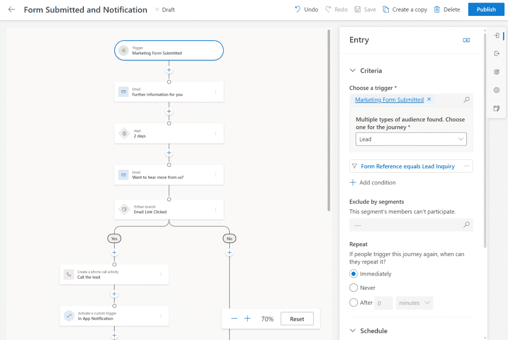 In my case, my lead who submits a form receives an initial informative email and a follow-up two days later. If he clicks on the ‘Contact’ button there, we create a phone call first and then notify the lead owner. Overall, my journey looks like this: