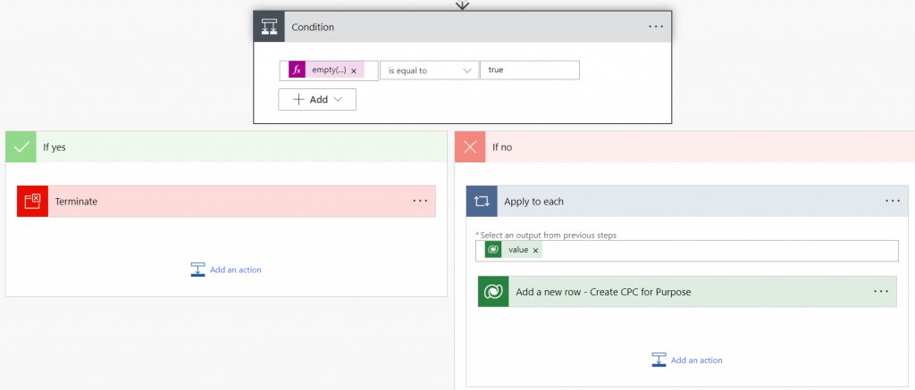empty(outputs('List_rows_-_Find_existing_CPCs_for_Purpose')?['body/value'])In the next action, I create the new data record as follows: