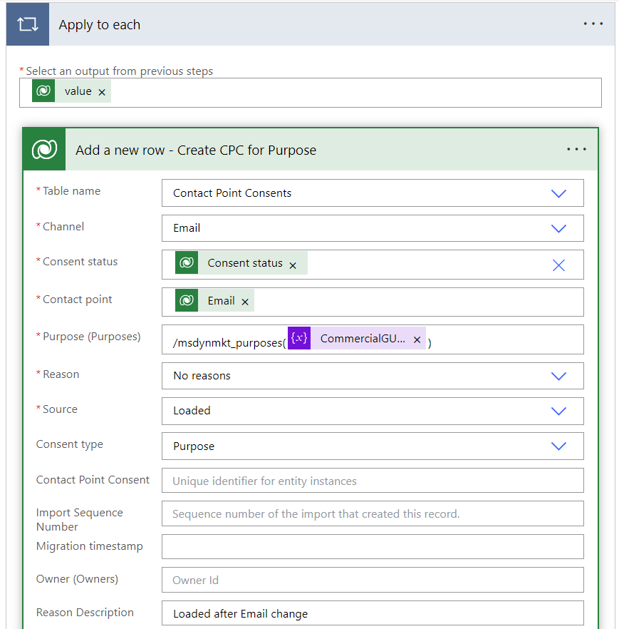 - Consent status: Use the dynamic value from the list rows function of the existing contact point consent