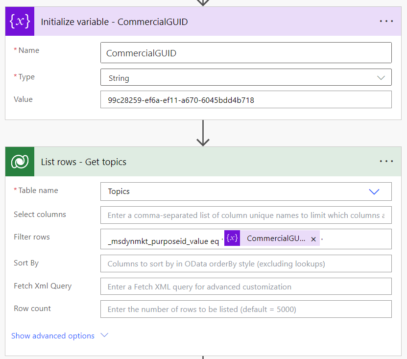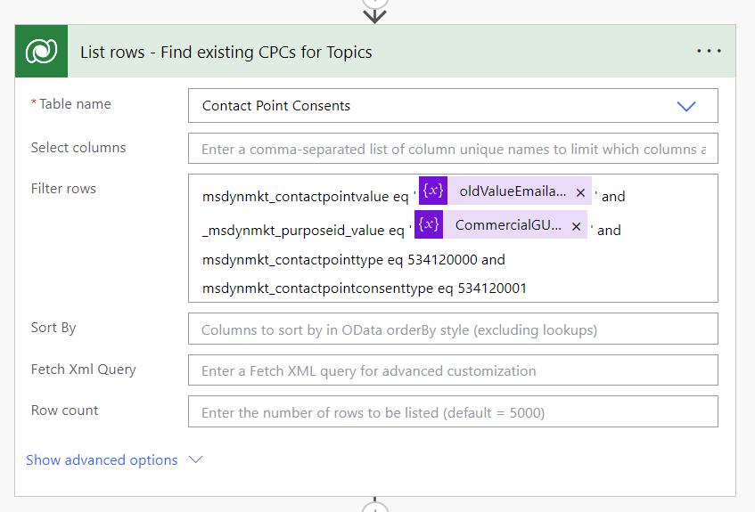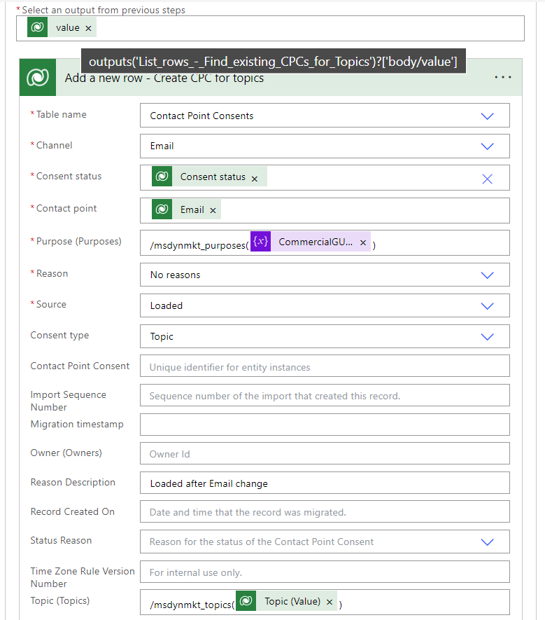 msdynmkt_contactpointvalue eq '@{variables('oldValueEmailaddress')}' and _msdynmkt_purposeid_value eq '@{variables('CommercialGUID')}' and msdynmkt_contactpointtype eq 534120000 and msdynmkt_contactpointconsenttype eq 534120000The msdynmkt_contactpointconsenttype field specifies whether it is a data record for purposes or topics. 534120000 stands for purpose and 534120001 stands for topic. And the field msdynmkt_contactpointtype with the value 534120000 defines that the channel is email.