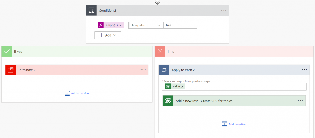 msdynmkt_contactpointvalue eq '@{variables('oldValueEmailaddress')}' and _msdynmkt_purposeid_value eq '@{variables('CommercialGUID')}' and msdynmkt_contactpointtype eq 534120000 and msdynmkt_contactpointconsenttype eq 534120001And here, too, the condition appears again, which either ends the flow or creates a new data record for the new email address.
