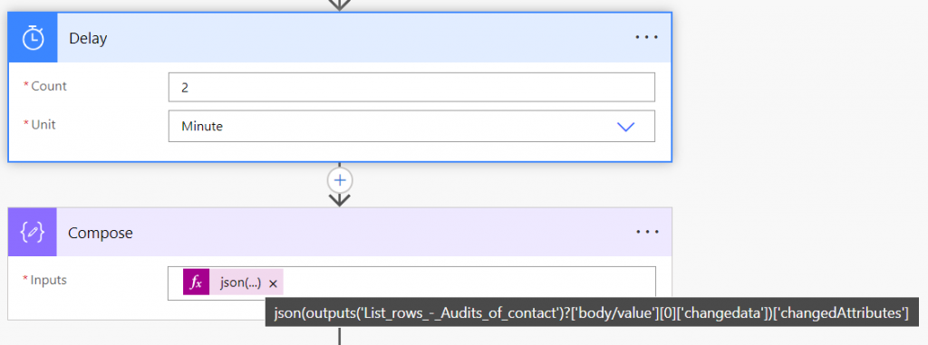 Next, I add a delay action for 2 minutes, because I have realised that the audit history is not always available immediately after saving the contact.